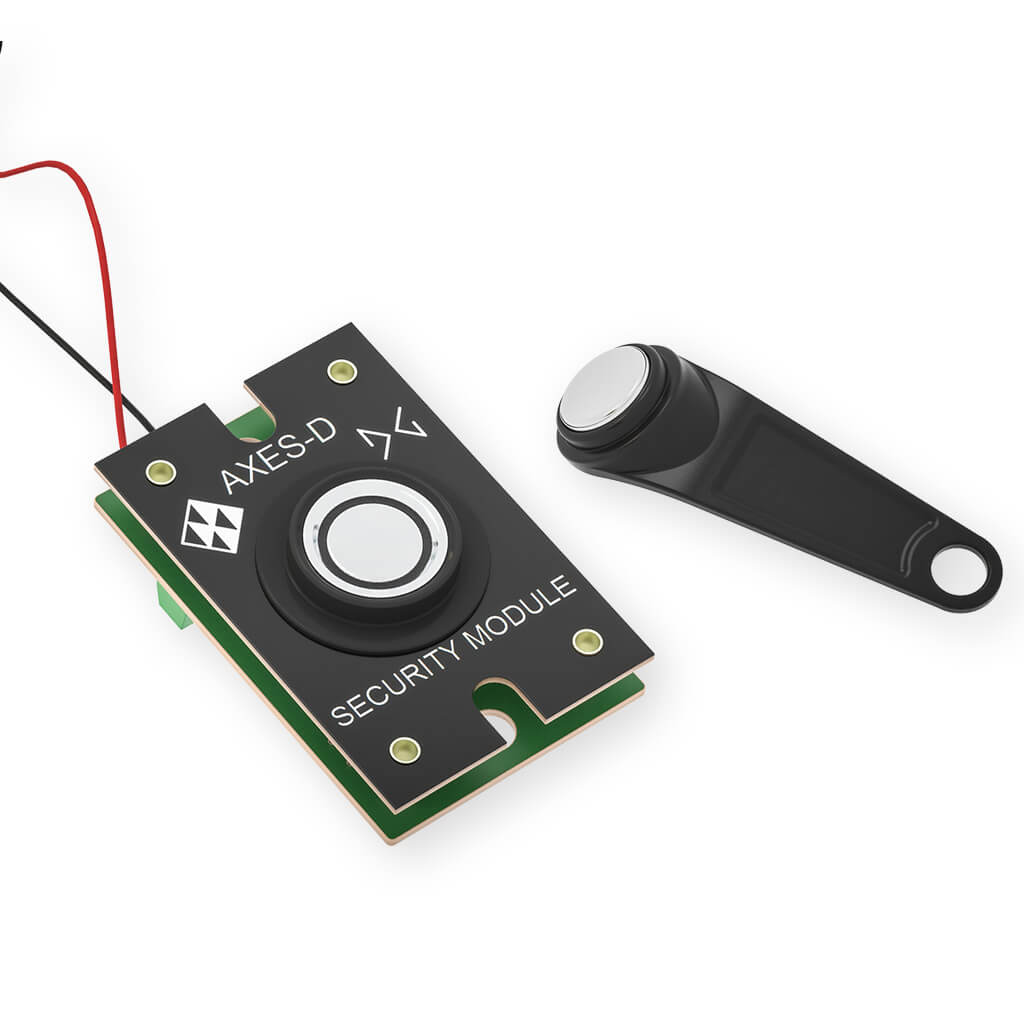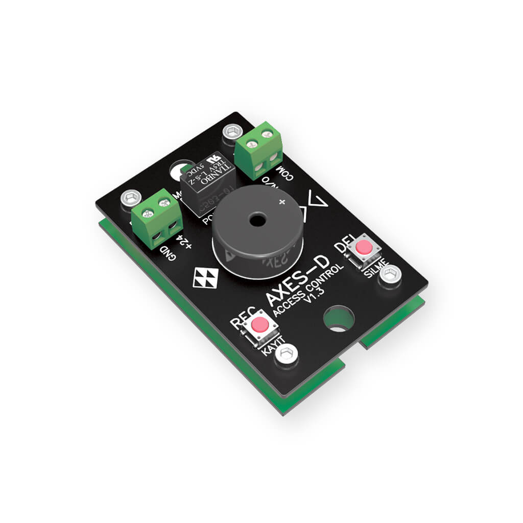AXES is a general purpose security module. It uses iButton type touch memories to identify the keys. If a predefined key touches on the stainless steel probe, AXES shorts the relay contacts for five seconds and leaves the contacts open after this period. AXES warns the user with visual and auditory ways with on-board beeper and in-probe LED ring.