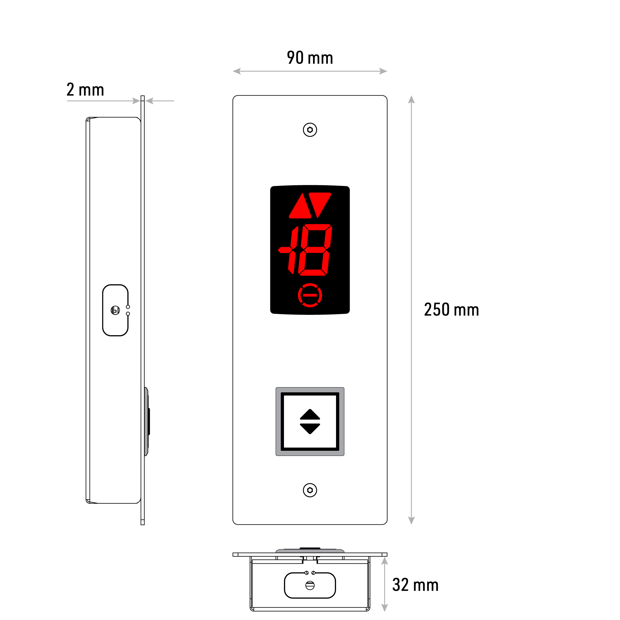 EC – scalable flush mounted landing operator panels. 2 mm thick flat front panel make it look thin on the wall. All the electronic components are well organised and safely hidden inside the backbox. Compatible with 7 Segment & LED matrix and LCD indicators. QUAD series premium quality push buttons are used. User-friendly structure ensures reliable installation for wide range of elevator applications.
