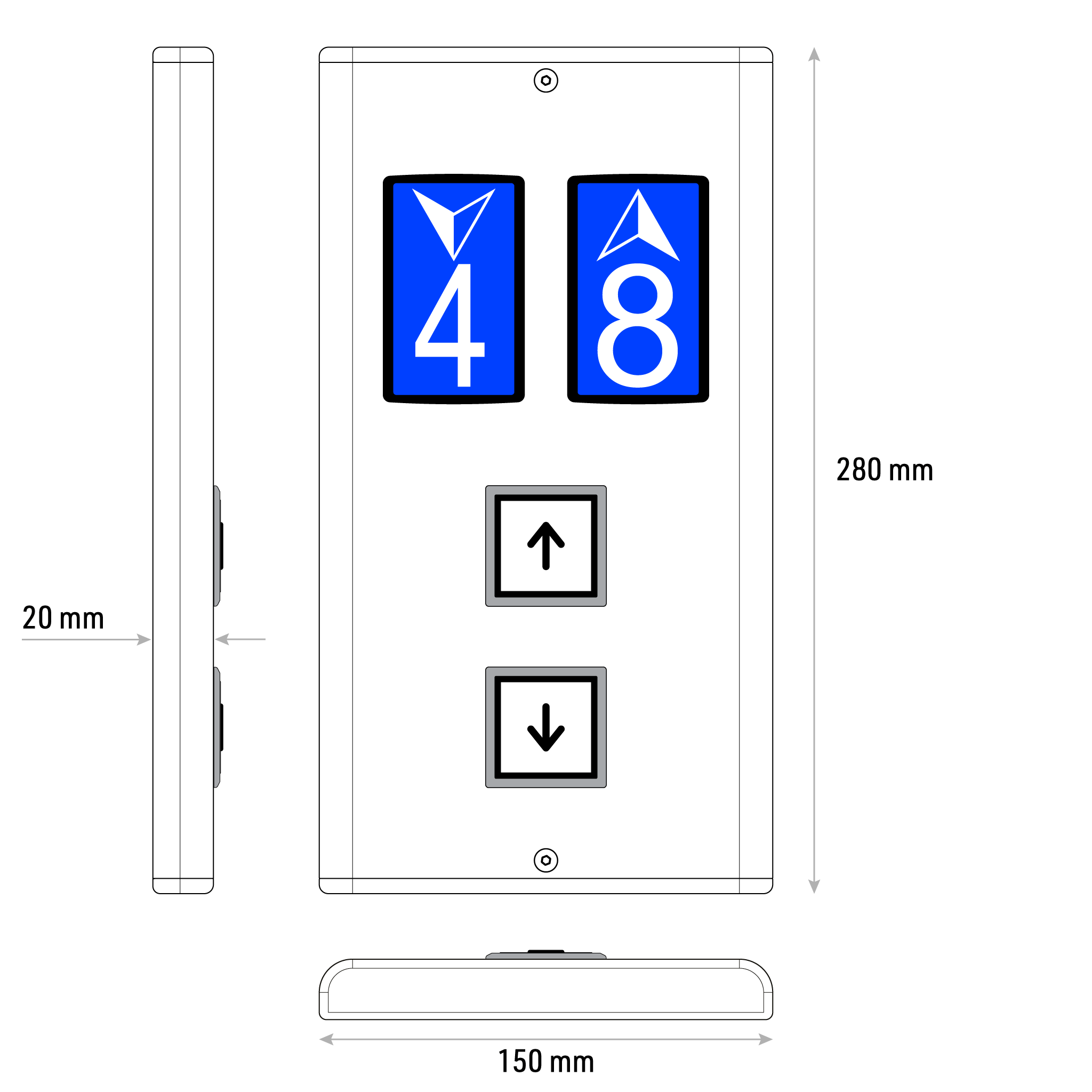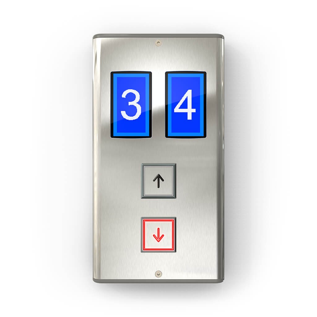 MONO – scalable surface mounted landing operator panels. Both horizontal and vertical dimensions can be customized in width and height. The rounded edge design gives a smooth look to your elevator hall design. Compatible with parallel type 7 Segment & LED matrix and LCD indicators. QUAD series premium quality push buttons and fixtures are used in MONO landing operator panels to make more flexible and robust design, so they can be suitable for most elevator applications.