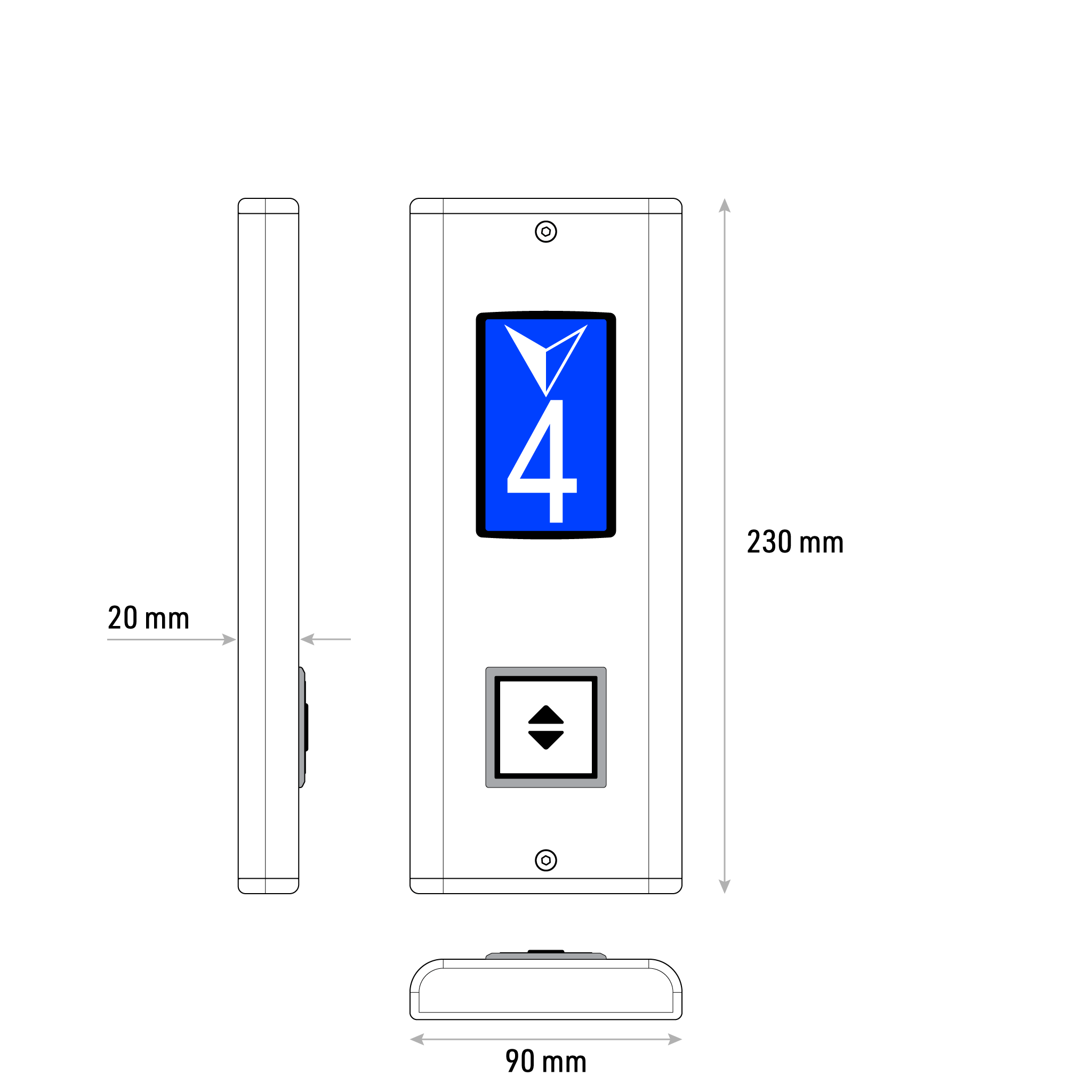 MONO – ölçüsü değişebilir sıva üstü kat kasetleri. Hem yatay hem dikey ölçülerin en ve boyları ihtiyaca göre düzenlenebilir. Yuvarlak kıvrımlı kenar tasarımı asansör holü mimarisinde daha ince ve şık görünmesini sağlar. 7 Segment & Dotmatris LED gösterge ile LCD göstergeler ile uyumludur. QUAD birinci sınıf kalite butonların kullanıldığı esnek ve sağlam tasarım pek çok farklı türde asansör uygulamasında kullanılabilir.