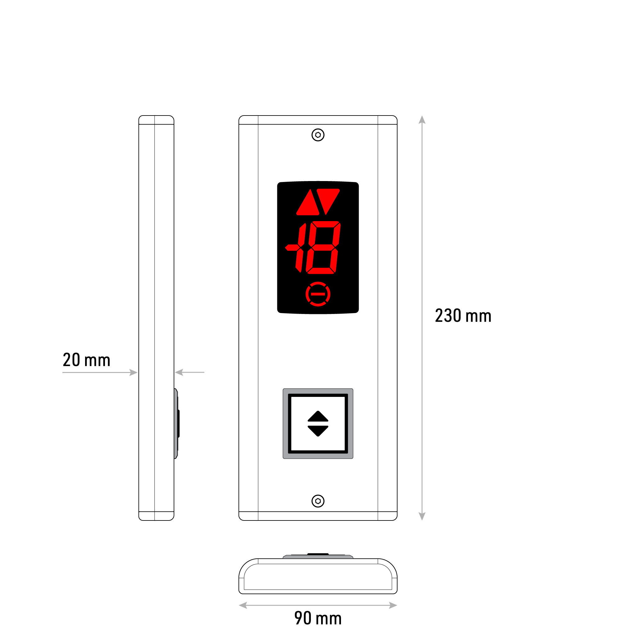 MONO – ölçüsü değişebilir sıva üstü kat kasetleri. Hem yatay hem dikey ölçülerin en ve boyları ihtiyaca göre düzenlenebilir. Yuvarlak kıvrımlı kenar tasarımı asansör holü mimarisinde daha ince ve şık görünmesini sağlar. 7 Segment & Dotmatris LED gösterge ile LCD göstergeler ile uyumludur. QUAD birinci sınıf kalite butonların kullanıldığı esnek ve sağlam tasarım pek çok farklı türde asansör uygulamasında kullanılabilir.