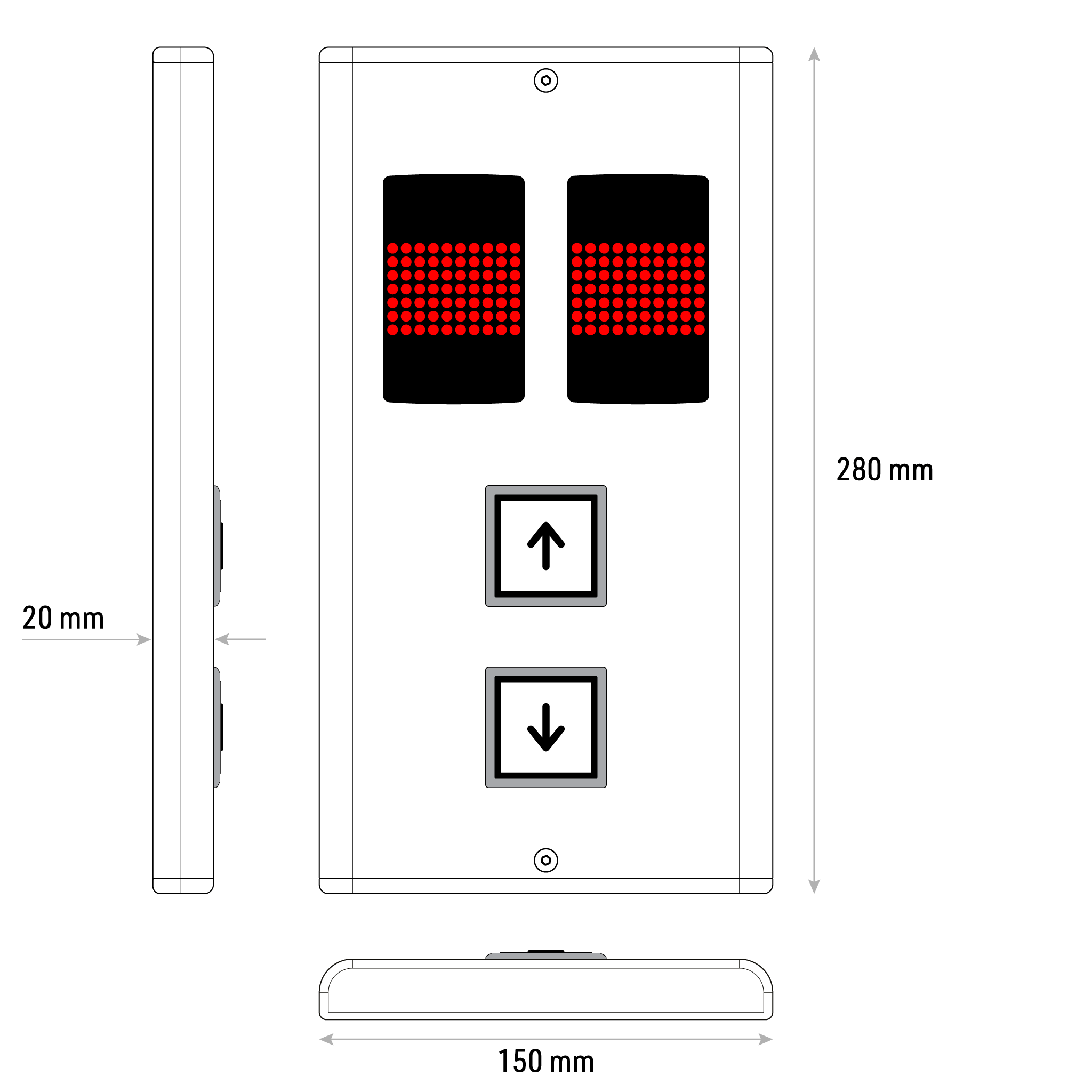 MONO – ölçüsü değişebilir sıva üstü kat kasetleri. Hem yatay hem dikey ölçülerin en ve boyları ihtiyaca göre düzenlenebilir. Yuvarlak kıvrımlı kenar tasarımı asansör holü mimarisinde daha ince ve şık görünmesini sağlar. 7 Segment & Dotmatris LED gösterge ile LCD göstergeler ile uyumludur. QUAD birinci sınıf kalite butonların kullanıldığı esnek ve sağlam tasarım pek çok farklı türde asansör uygulamasında kullanılabilir.